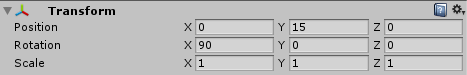インスペクターでPositionを(0,15,0)、Rotationを(90,0,0)に設定します。